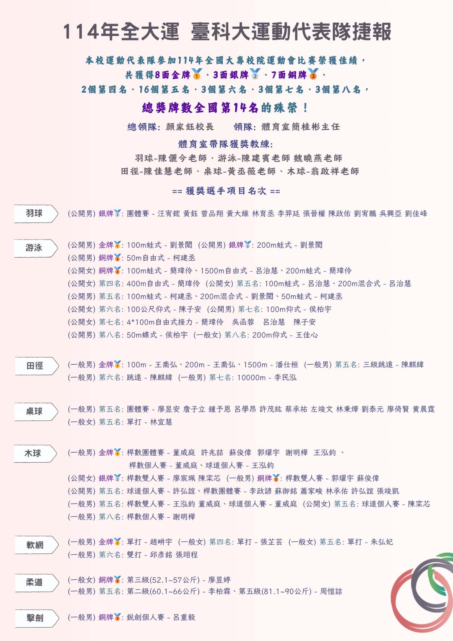 【捷報】本校運動代表隊參加114年全國大專校院運動會比賽榮獲佳績